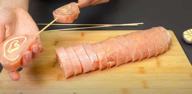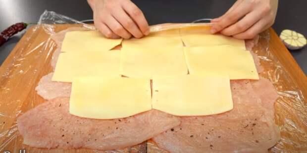 На мясной слой выкладываем сырные пластины, заворачиваем их в рулет из стейков.