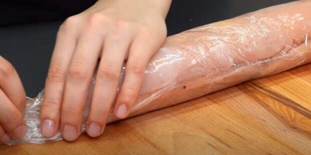 Куриную грудку нарезаем вдоль на несколько тонких стейков. Каждый стейк накрываем пищевой пленкой и тщательно отбиваем молотком.