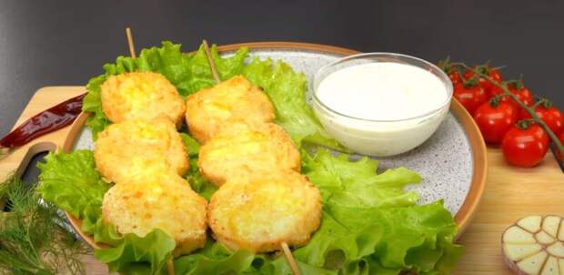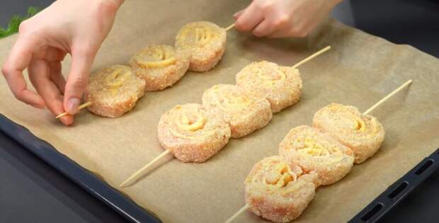 По 3 кусочка насаживаем на шпажку, окунаем во взбитые яйца, а затем в панировочные сухари. Отправляем шашлык на противень, застеленный пергаментом.