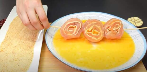 Перед тем как вынуть рулет из холодильника, в отдельной миске взбиваем яйца. Рулет избавляем от пищевой пленки и нарезаем поперек на порционные куски толщиной в 2-3 см.