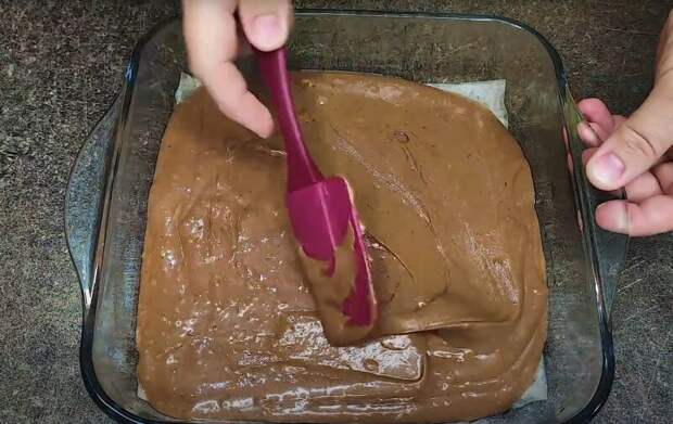 Просеиваем в яичную смесь муку, какао и разрыхлитель, замешиваем тесто. Выкладываем тесто в форму для выпечки, застеленную пергаментом, распределяем равномерно.