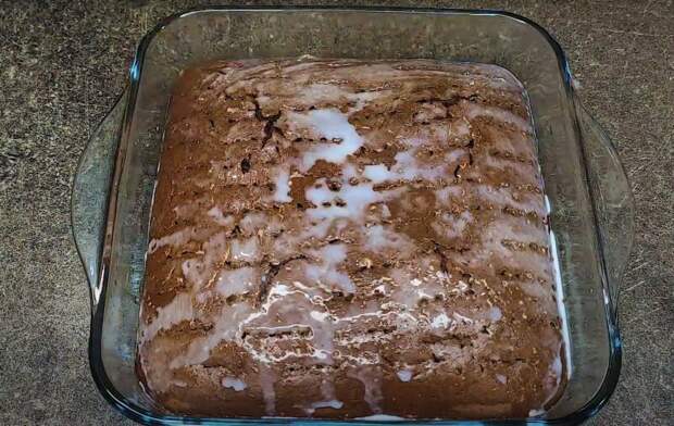 Пропитываем пирог молоком, заливаем его глазурью по всей верхушке.