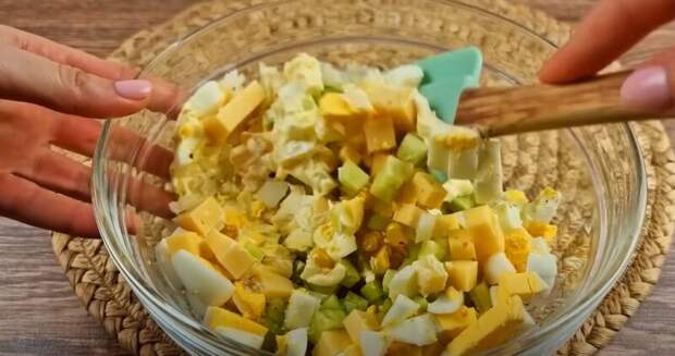 Отварные яйца аналогично мелко нарезаем и добавляем в салат. Блюдо солим, заправляем майонезом.
