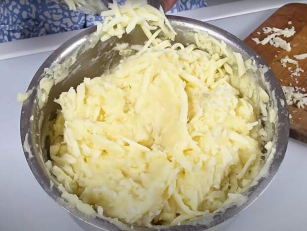 Натираем на крупной терке сыр и высыпаем в картофельное пюре, перемешиваем.