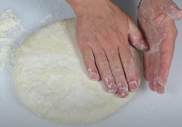 Оставляем тесто под целлофаном на 15 минут. Раскатываем тесто руками в круглый пласт. В середине пласта теста должно быть больше, чем по краям.