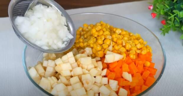 Мариновать нужно до остывания маринада, периодически перемешивая. Когда все остынет, лук сливаем от маринада и отжимаем от излишек жидкости.Яйца режем кубиками и смешиваем с кубиками морковь и консервированной кукурузой.