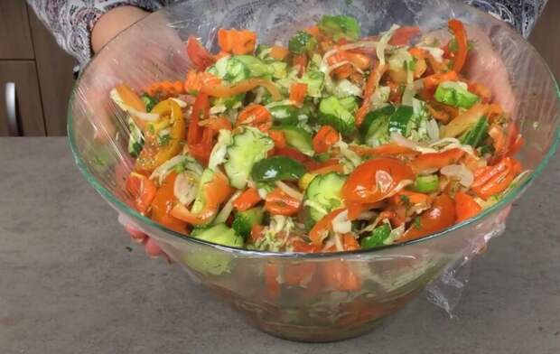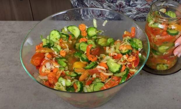Получается красивый маринованный салат на зиму. Это универсальное решение для ужина и для праздничного стола.