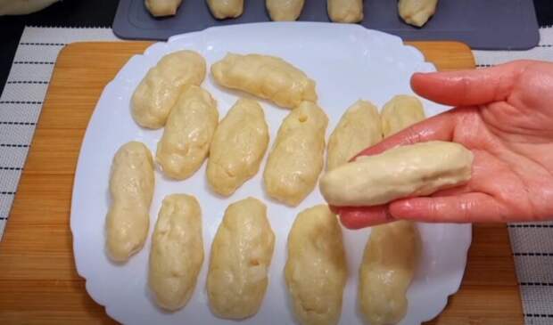 Смазываем руки растительным маслом и начинаем формировать пирожки овальной формы из кусочков теста среднего размера.