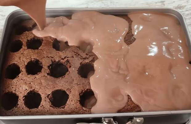 Оставляем бисквит слегка остыть, а затем вынимаем из формы. При помощи горлышка от бутылки делаем кратеры по всей поверхности пирога, а затем снова пирог убираем в форму.