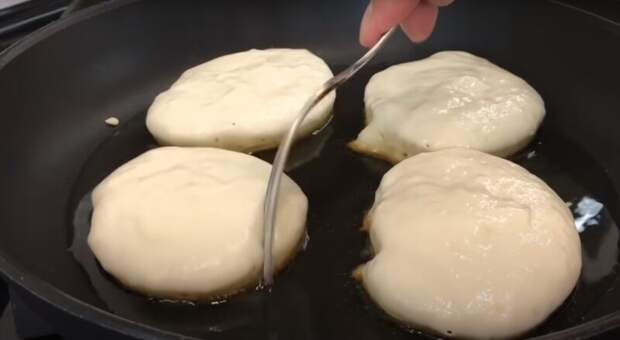 Важно соблюдать расстояние между оладьями, иначе их будет трудно переворачивать. Обжариваем оладьи с обеих сторон до румяной корочки. При обжарке второй стороны накрываем сковороду крышкой.
