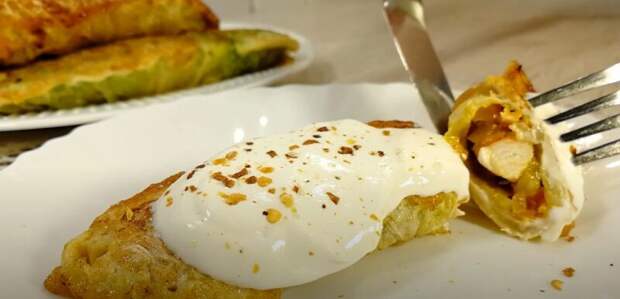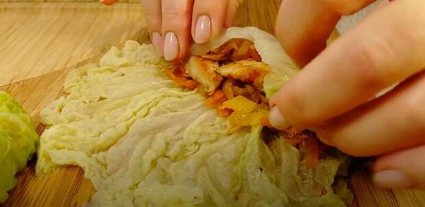 На капустный лист выкладываем обжаренные овощи, а поверх кладем куриную соломку. Заворачиваем ингредиенты в капустный лист.