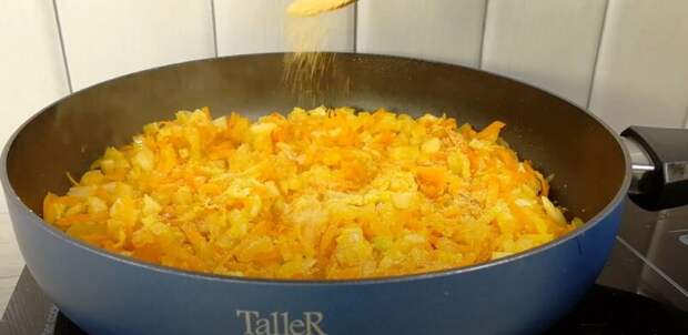 Лук нарезаем средними кубиками, морковь натираем на крупной терке. На сковородку, смазанную растительным маслом, выкладываем сначала лук. После того как лук немного будет обжарен, добавляем морковь. Продолжаем обжаривать овощи на среднем огне 2–3 минуты.