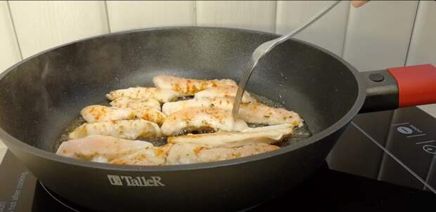 Куриную грудку нарезаем достаточно крупной соломкой, посыпаем солью, черным молотым перцем и паприкой. Обжариваем куриную соломку с двух сторон до румяной корочки около 2–3 минут.