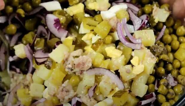 Нарезаем четверть кольцами лук, кладем в салат вместе с консервированным горошком. Солим и перчим салат, вливаем ароматное масло и перемешиваем.