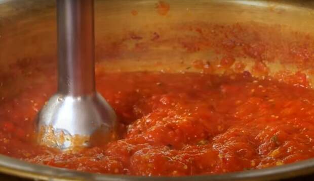 Как только из томатной смеси выпарилась вода, снимаем с огня и на малых оборотах блендером измельчаем кусочки перца в Аджике.